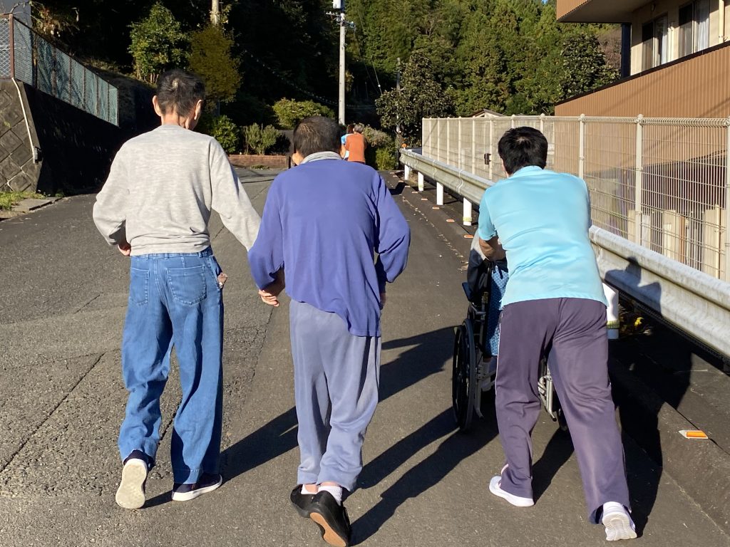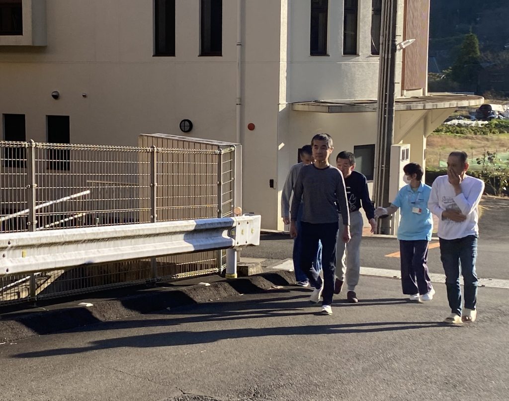 普段している歩く練習を基に避難していきます。坂道は結構大変で登り切れるか心配しましたが、職員が手を引いたり、車椅子を押したり、声をかけて一緒に進み、避難場所のグラウンドまで進むことができました。