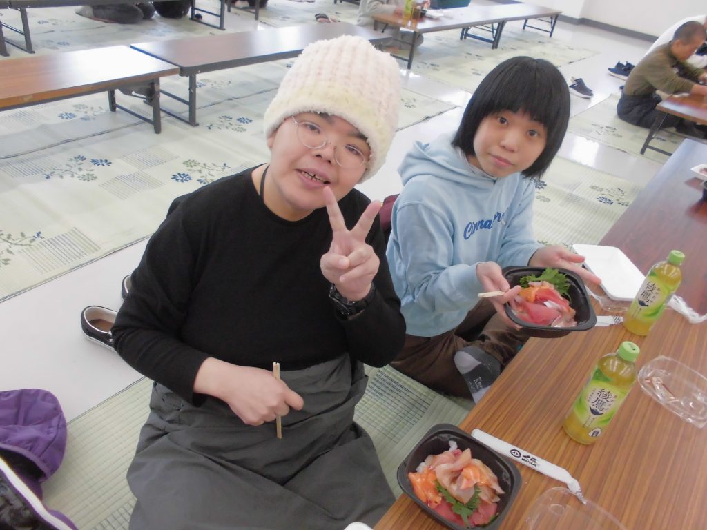 荘に戻ってからは、じゃんけん大会を開催しました。勝ち負けに一喜一憂しながら、大いに盛り上がりました。昼食は海鮮丼やカップラーメンを作り、皆さんで美味しくいただきました。