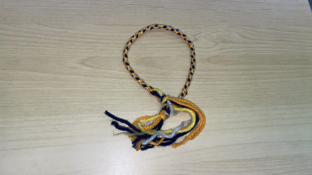 好きな色の毛糸を7本選んで編み込んでいくのですが順番に編み込んでいくことで意外と簡単に作ることが出来ました。