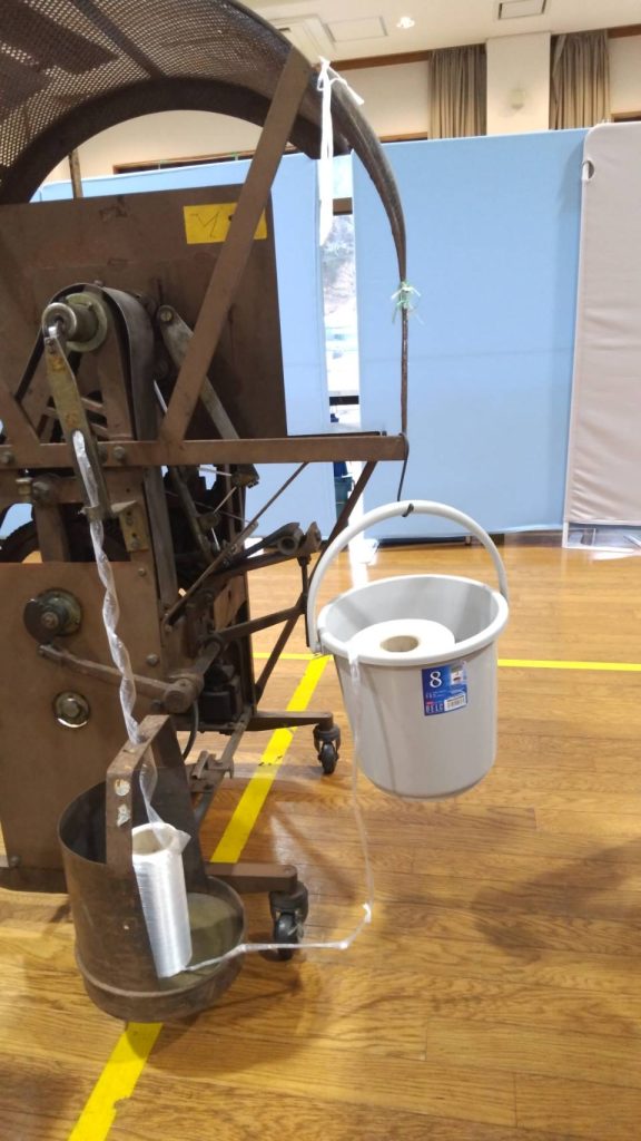 かりんグループ職員が早速対策を考えてくださり、バケツを床に置かず結束機につる下げる形で躓くリスクの回避を行いました。