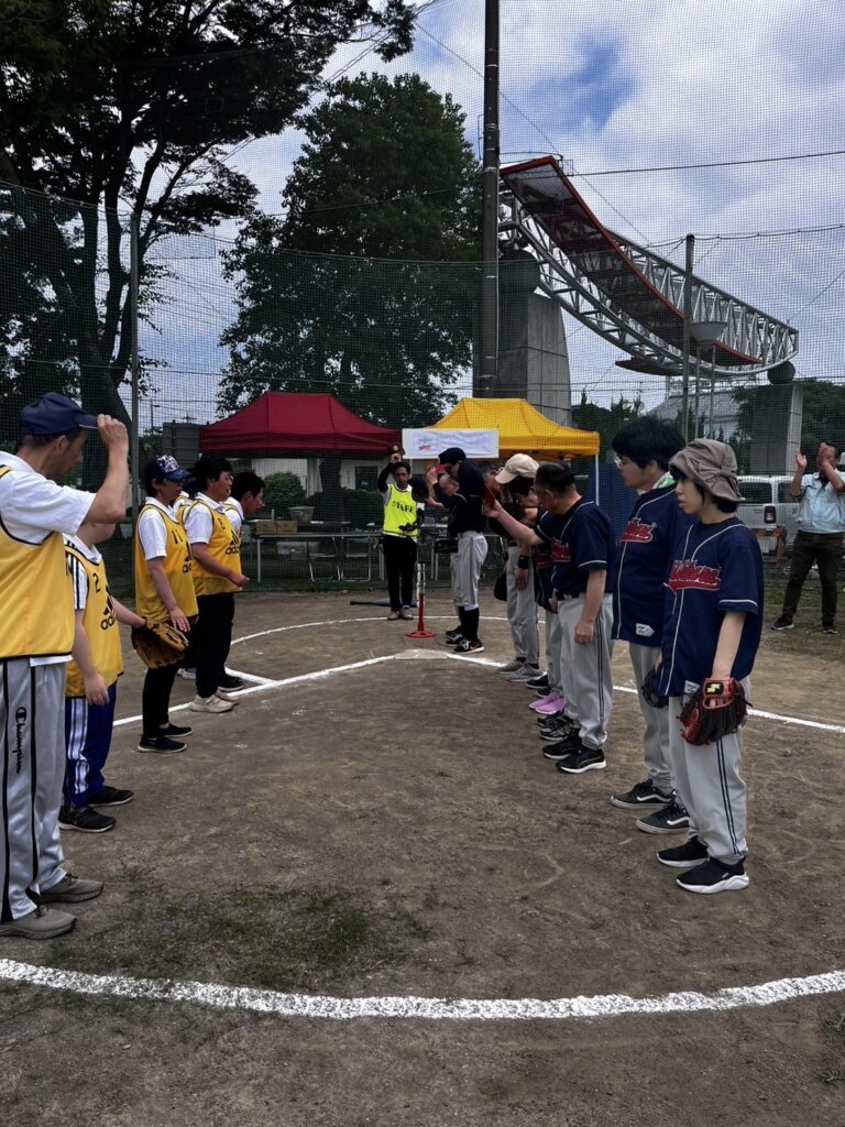今回はTボールの試合経験が少ないご利用者も多く、また気温も上がり体力が奪われる厳しい条件の中、参加ご利用者全員で攻守ともに声かを掛け合いお互いを励まし合って好プレーを連発させておりました。また支援員だけでなく常務理事や課長、医務の職員も応援に駆け付けみんなで良い雰囲気作りも行い、厳しい条件下のもとでも最後まで笑顔でプレー出来ました。