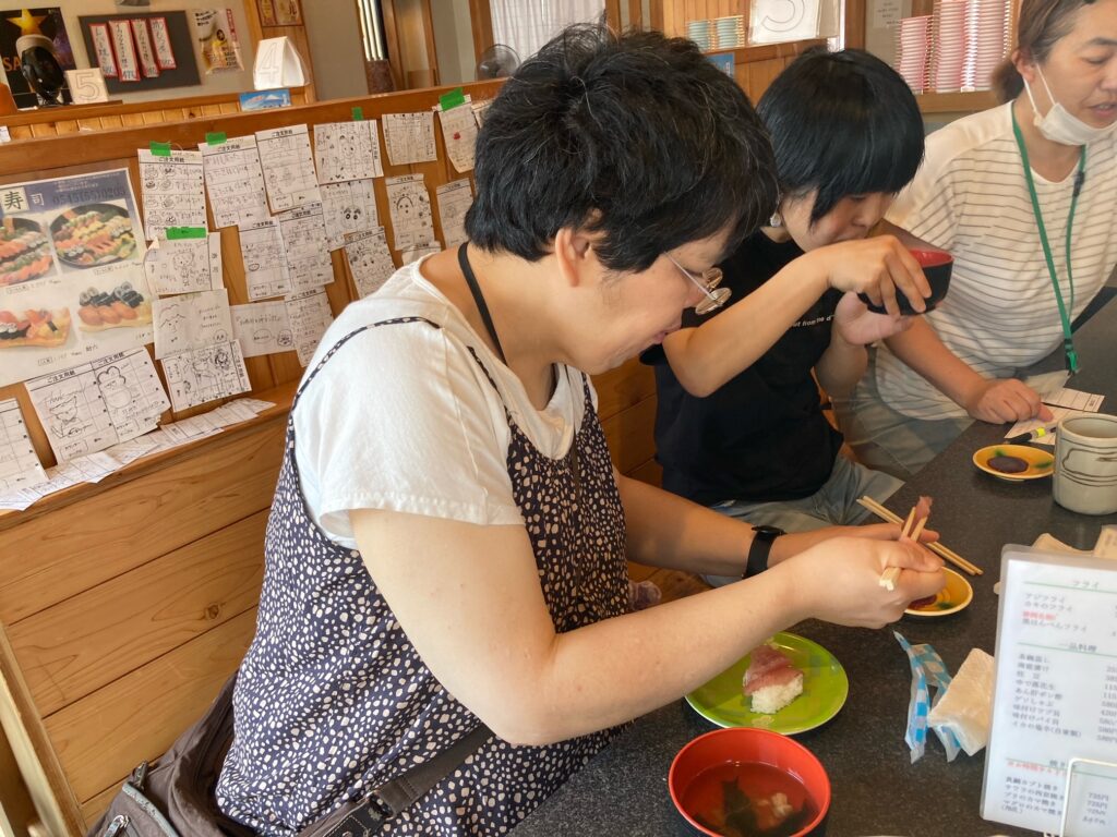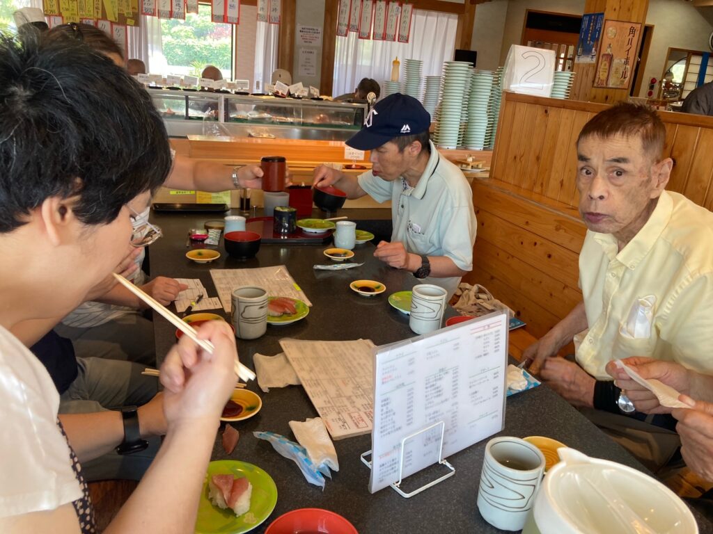 今回は「魚磯」というお店を利用させて頂きました。魚磯はマグロやサーモンなど定番メニューに加えて、トビウオや太刀魚、セグロイワシなど沼津港など地元の漁港でとれた新鮮なお魚を1皿115円というリーズナブルのお値段で頂けるお店になっており、目の前でお寿司を握って頂けることも特徴です。最初は慣れない雰囲気に戸惑うご利用者も見られましたが、慣れてきたりシステムが分かってきてからは楽しそうに積極的にネタを選んで召し上がる様子が見られました。豊富なメニュー表の中から嬉しそうに注文するネタを選んでいるご利用者もいれば、回ってくるお寿司の中から美味しそうな物を探して召し上がっているご利用者もいて、それぞれの楽しみ方をみつけておりました。またただでさえリーズナブルで美味しいことに加えて、マグロや蒸しエビが3貫で115円だったり、イカの3点盛りや炙り魚3点盛りも115円だったりと更にお得なメニューがあったことにもとても喜んでおりました。