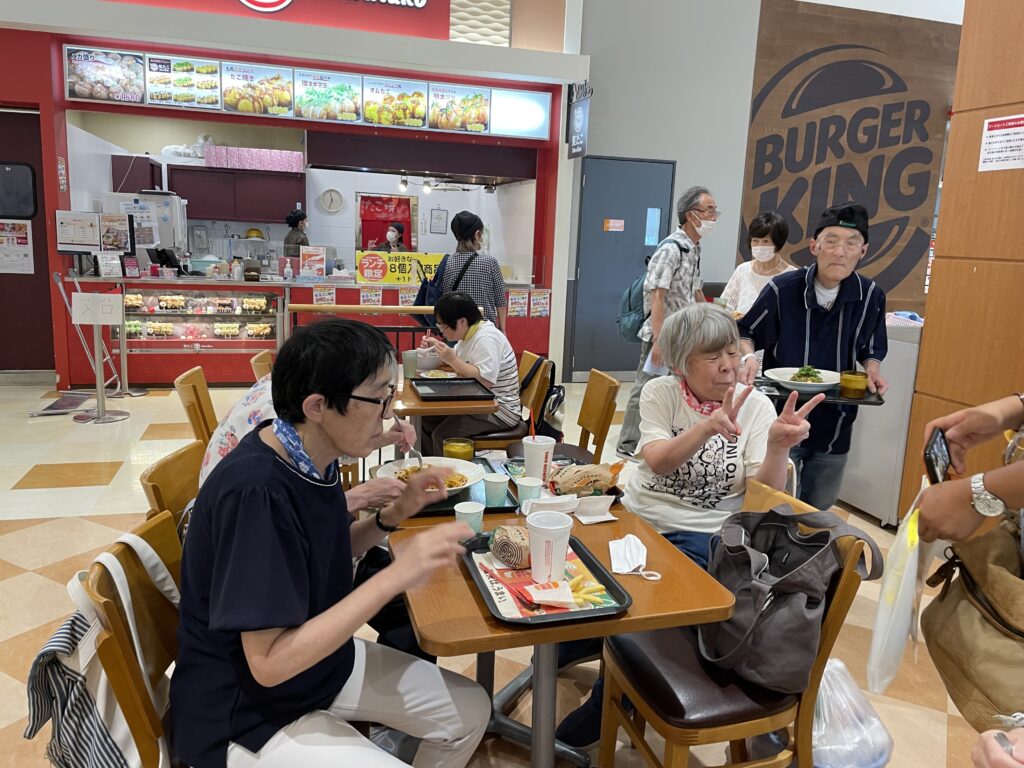 イオンタウン富士南フードコートには様々なお店が入っておりますが、今回はその中でもご利用者から特に人気の高いバーガーキング(ハンバーガー)、ジャスミン(中華料理)、パスタ屋一丁目(パスタ)の3店舗の中から特におすすめの人気メニューをいくつかピックアップして、それぞれのお好きな物を注文して召し上がっていただきました。