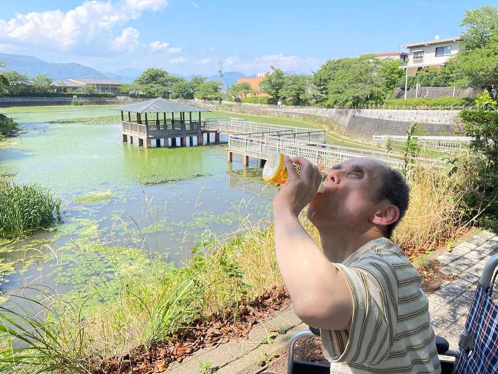 池のそばでは心地よい風にふかれながら、自然の中でのんびりとした時間を満喫。表情もやわらぎ、穏やかな笑顔が見られました。