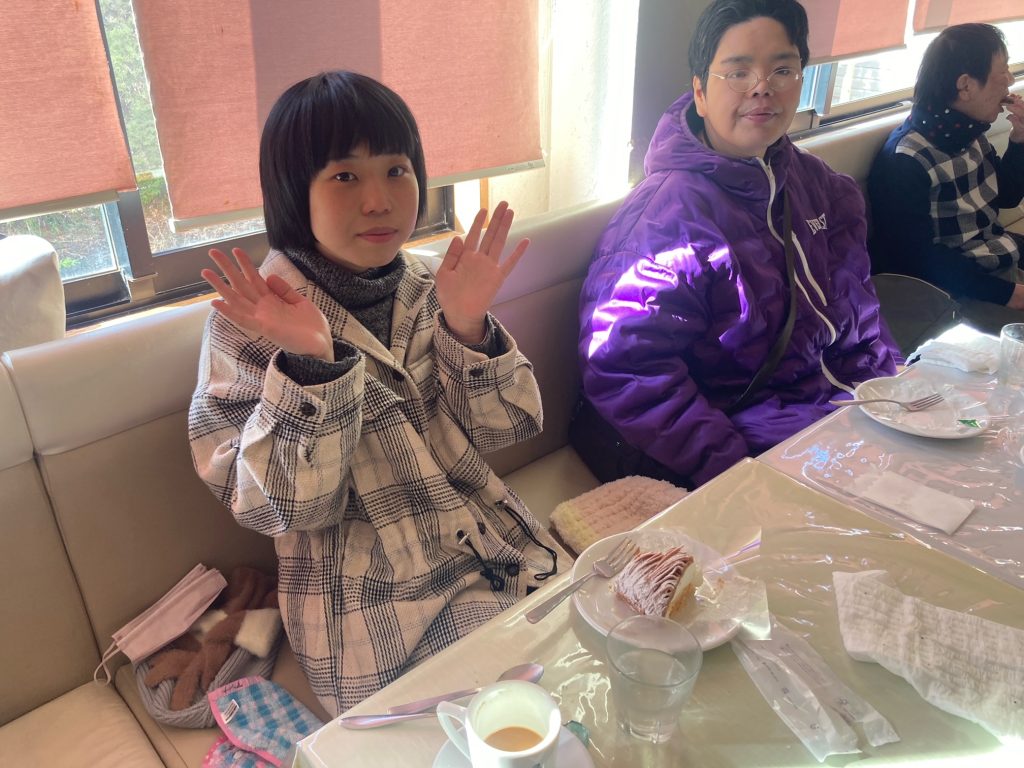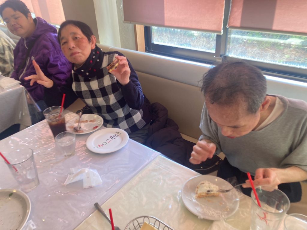 今回はクリスマスパーティも兼ねているということで焼き立てパン食べ放題の付いた豪華なランチコースとケーキのセットを召し上がっていただきました。食べ放題のパンの種類もとても豊富で、どのパンもとても美味しそうでご利用者様も目の色を輝かせながらパンを選ばれておりました。ランチメニューとケーキもご利用者それぞれでお好きな物を選んでおり、数あるメニューからご自身で選んだ料理やケーキが運ばれてきた時には大変喜ばれておりました。美味しい料理をたくさん見て食べれて大満足のランチになったと思います。